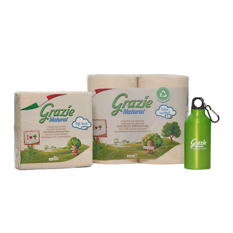 Un kit senza alberi aggiunti: per te 19 confezioni tra asciugatutto, tovaglioli ecologici e borraccia Grazie Natural in alluminio.