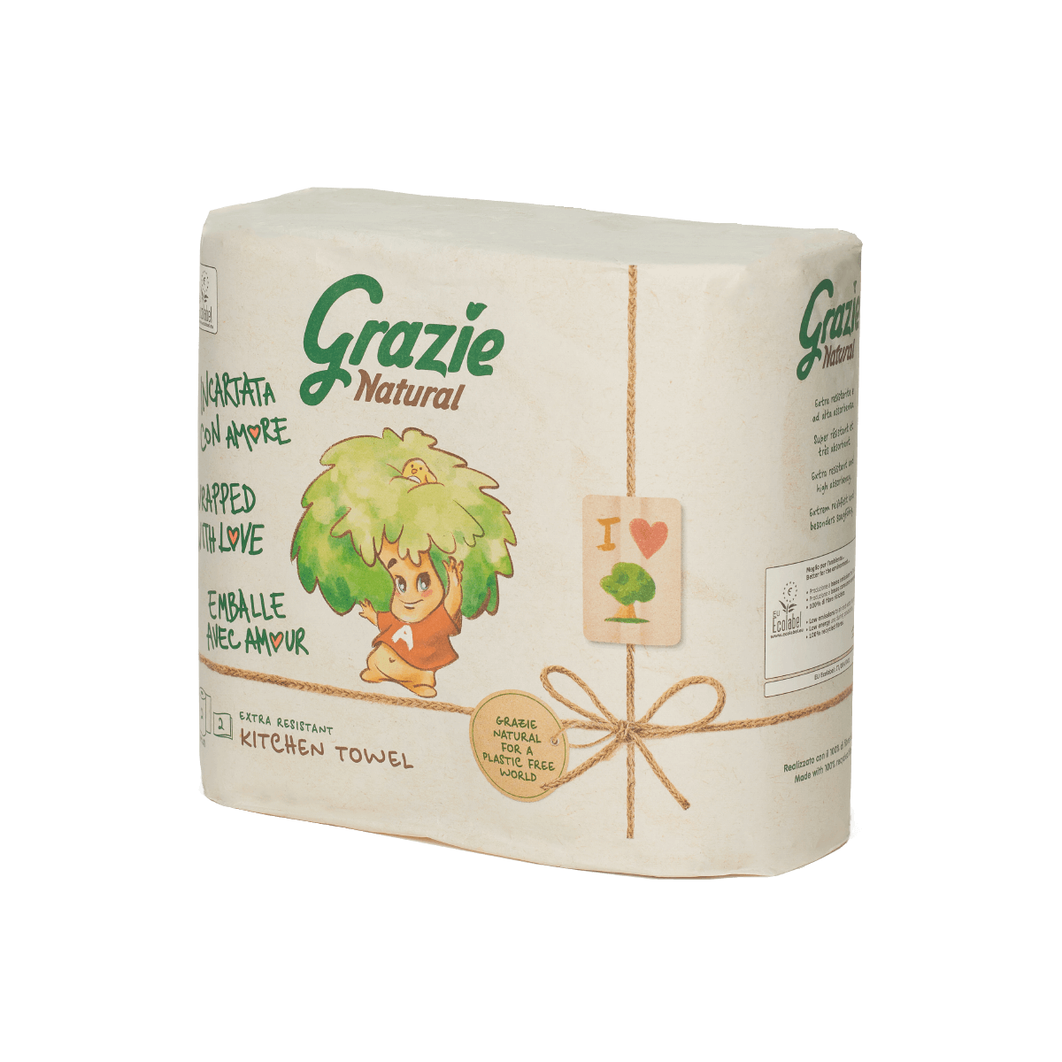 Con l’asciugatutto ecologico Grazie Natural, super assorbente e certificato Ecolabel e FSC, dai una mano al pianeta senza prosciugare le sue importanti risorse. Da oggi, con un innovativo pack in carta riciclata, riciclabile e compostabile.